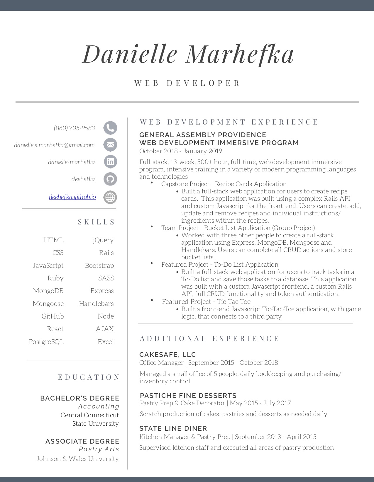 Prior to becoming a web developer, I spent 7 years within the restaurant industry as a pastry chef. I discovered coding, which eventually led me to General Assembly’s Web Immersive program, as a way to stream-line my restaurant’s website - and I developed a passion for code.